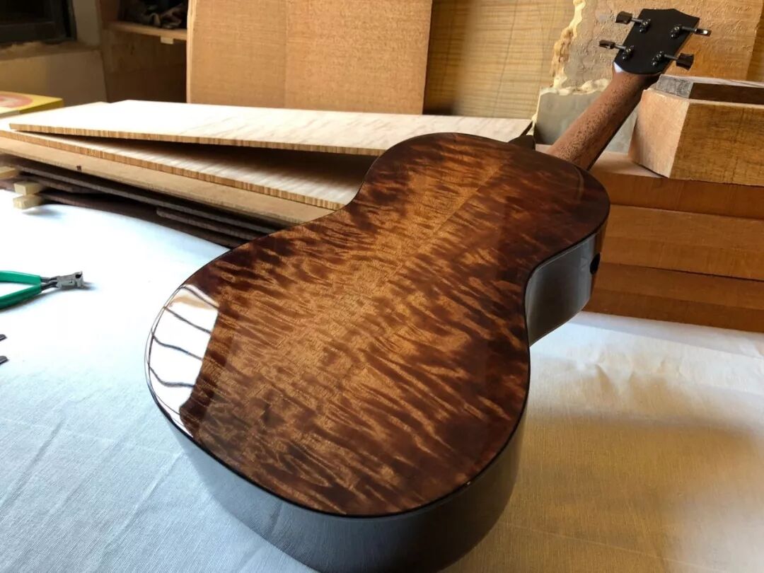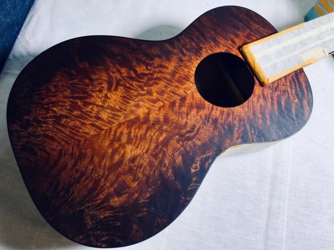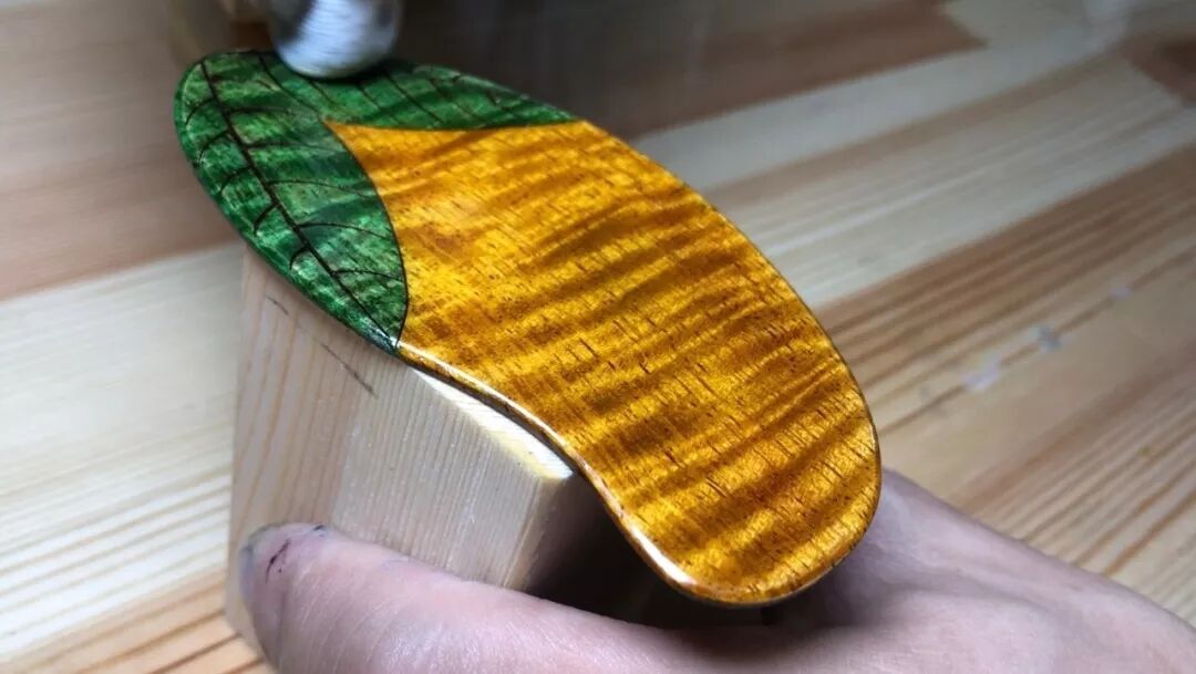 用棉布均匀蘸取染剂,为琴身上一层匀净的底色,紧接着用深色染剂沿琴身边缘擦色,再用浅色染剂进行渐变过渡,最后仔细调整色度来凸显大自然馈赠给芒果木的光怪陆离的天然侧影与纹理。